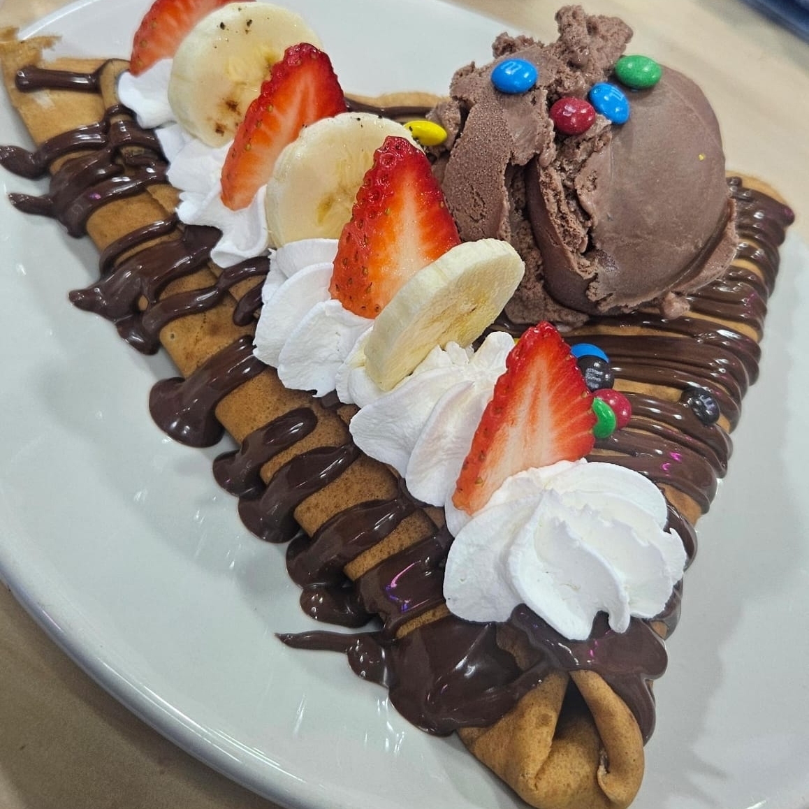 Nutella, plátano, fresas, lunetas, crema batida, helado.