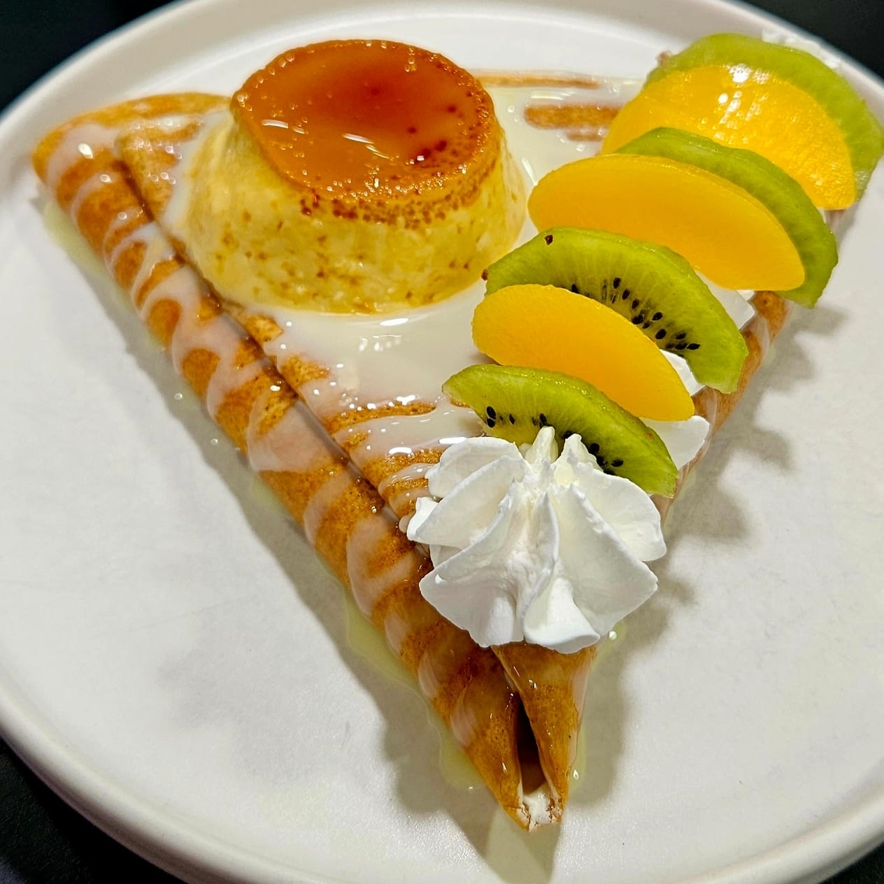 Lechera, Philadelphia, durazno, kiwi, crema batida, flan napolitano.