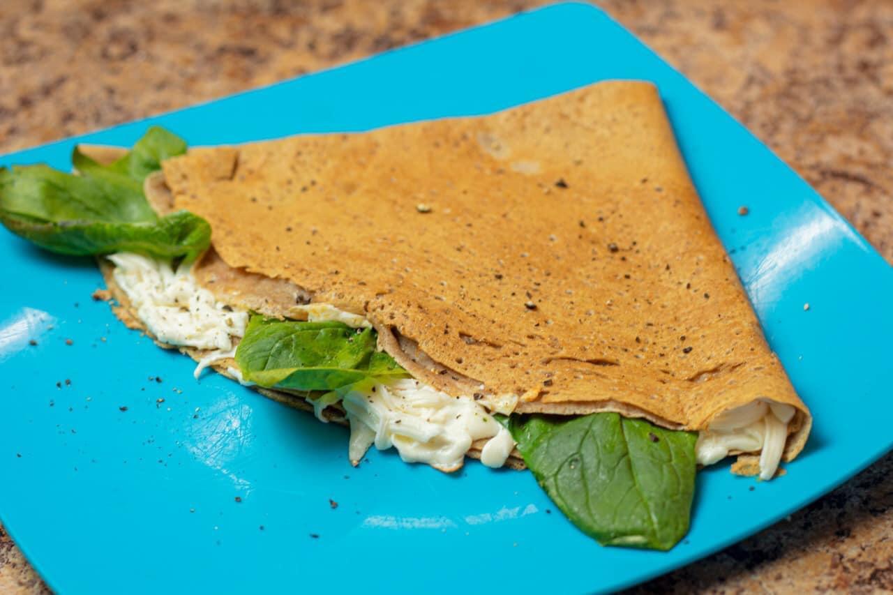 Crepa con tu queso favorito, espinacas, jitomates cherry, espinacas frescas, champiñones, pimienta al gusto, sal y parmesano.