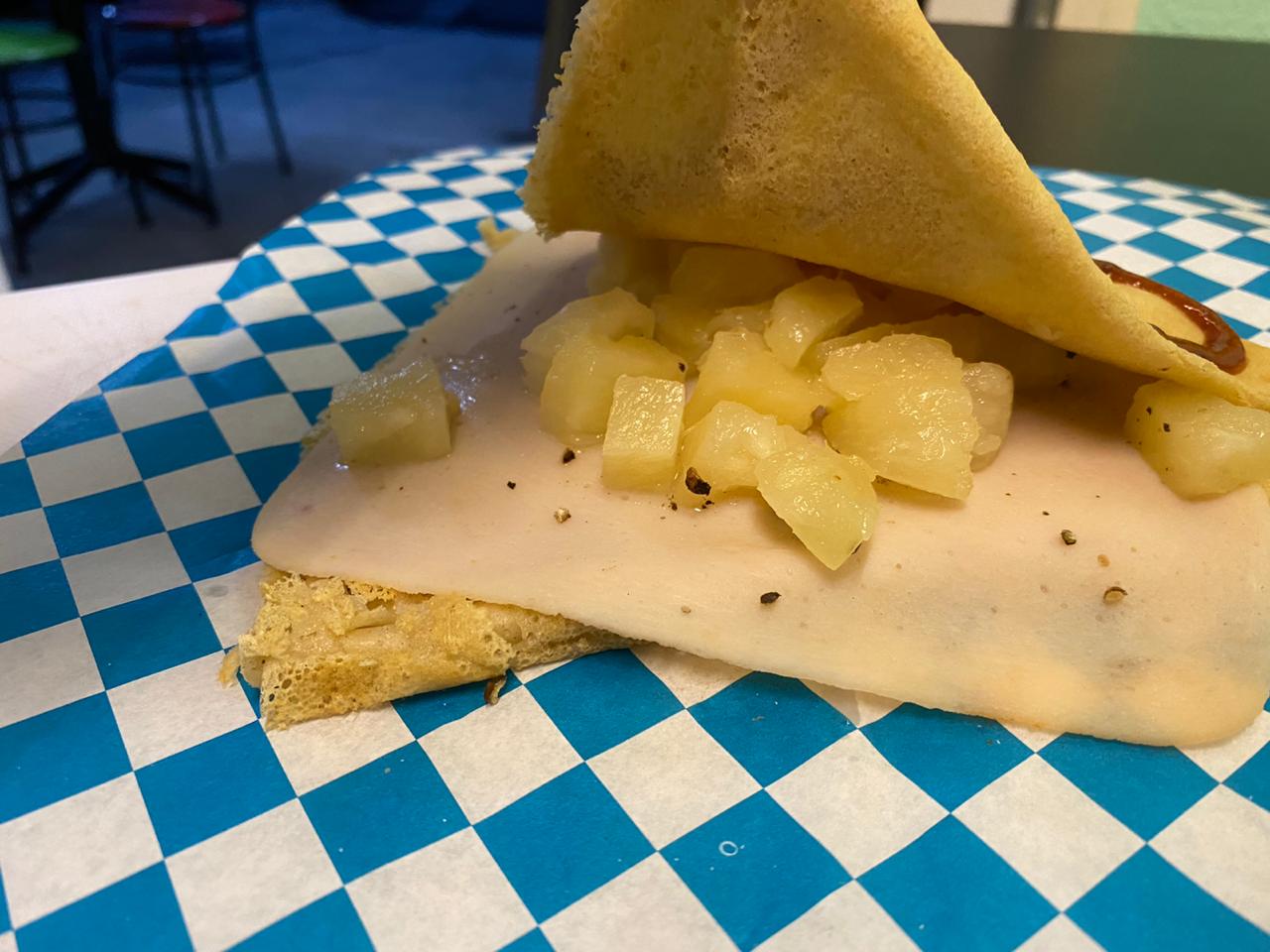 Crepa con jamón de pechuga de pavo ahumada, manchego, salsa pizza, trozos de piña, pimienta al gusto, sal y parmesano.