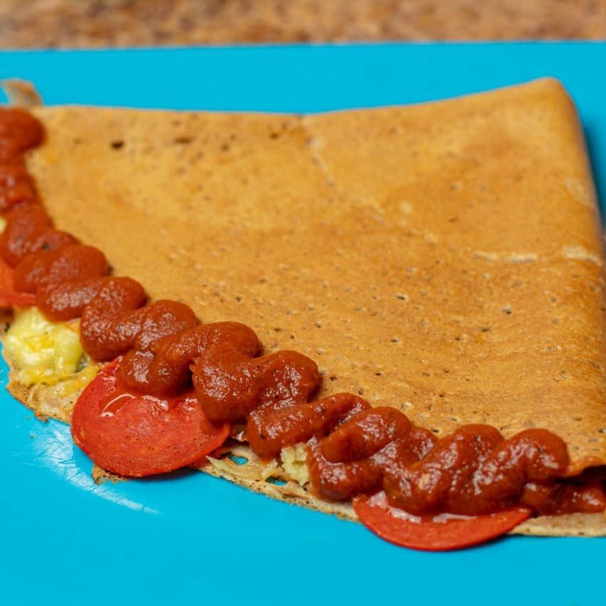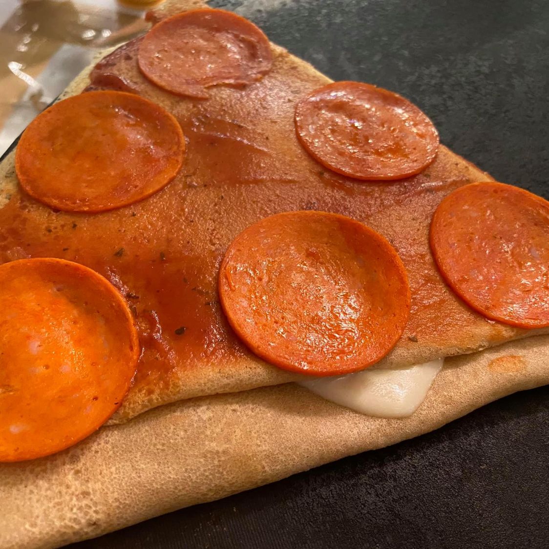 Crepa con salsa pizza, peperoni fresco, manchego, pimienta al gusto, sal y parmesano.