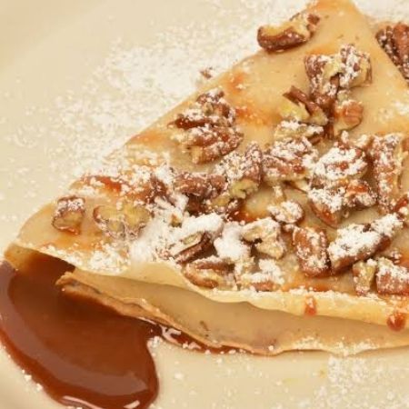 Crepa con nutella, ferrero en trozos, nuez, decorada con cacao encima.