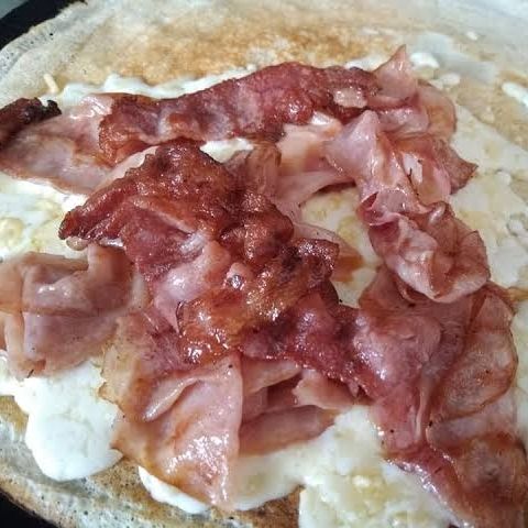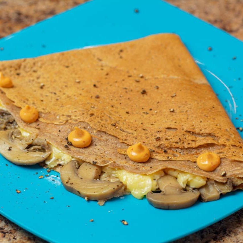 Crepa con manchego, champiñones , tocineta, pimienta al gusto, sal y parmesano.
