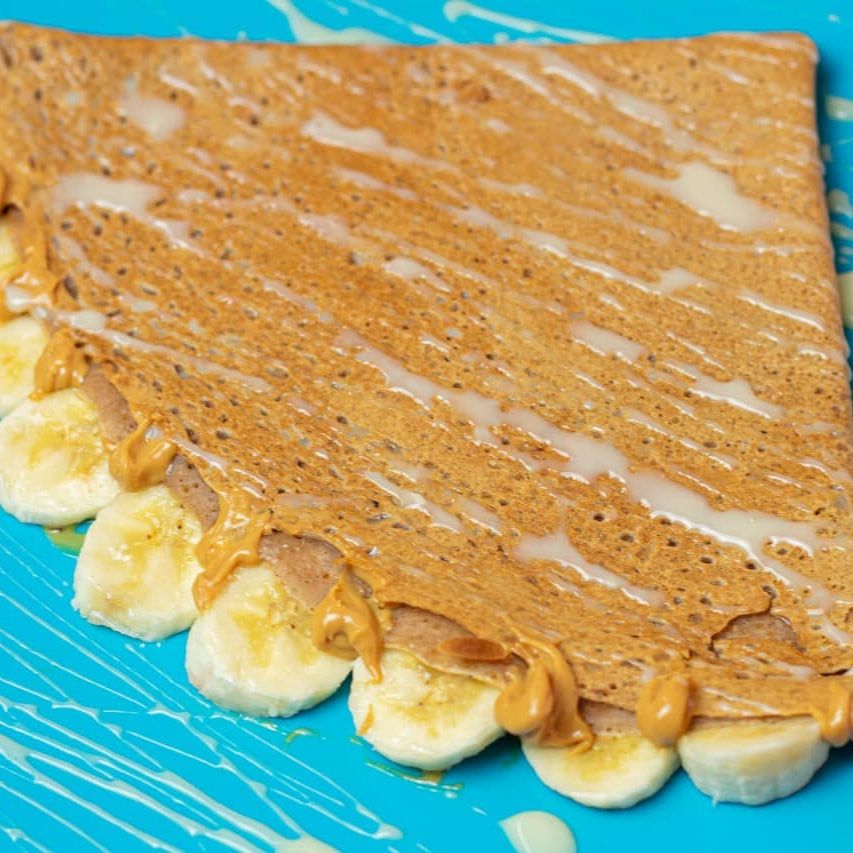 Crepa con crema de cacahuate, lechera y tu topping favorito.