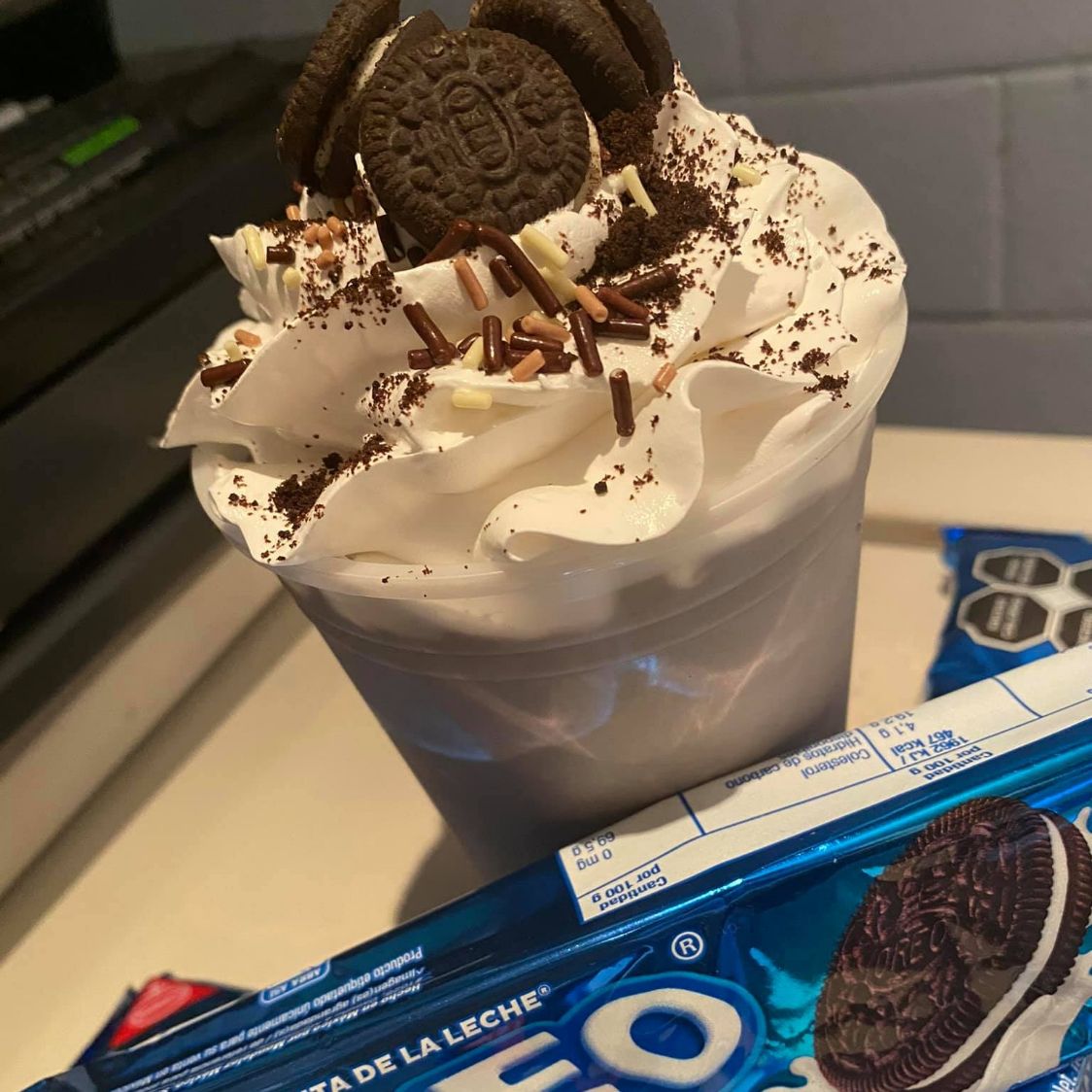 16 onzas elaborado con leche de tu elección, decorado con crema batida al gusto de calidad, chispas turin de chocolate. (NO LLEVA PEDAZO DE GALLETA OREO ENCIMA, SOLO DEMOSTRACIÓN)