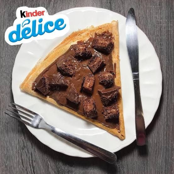 Crepa con nutella, kinder delice(pastelito), nuez, cacao encima.
