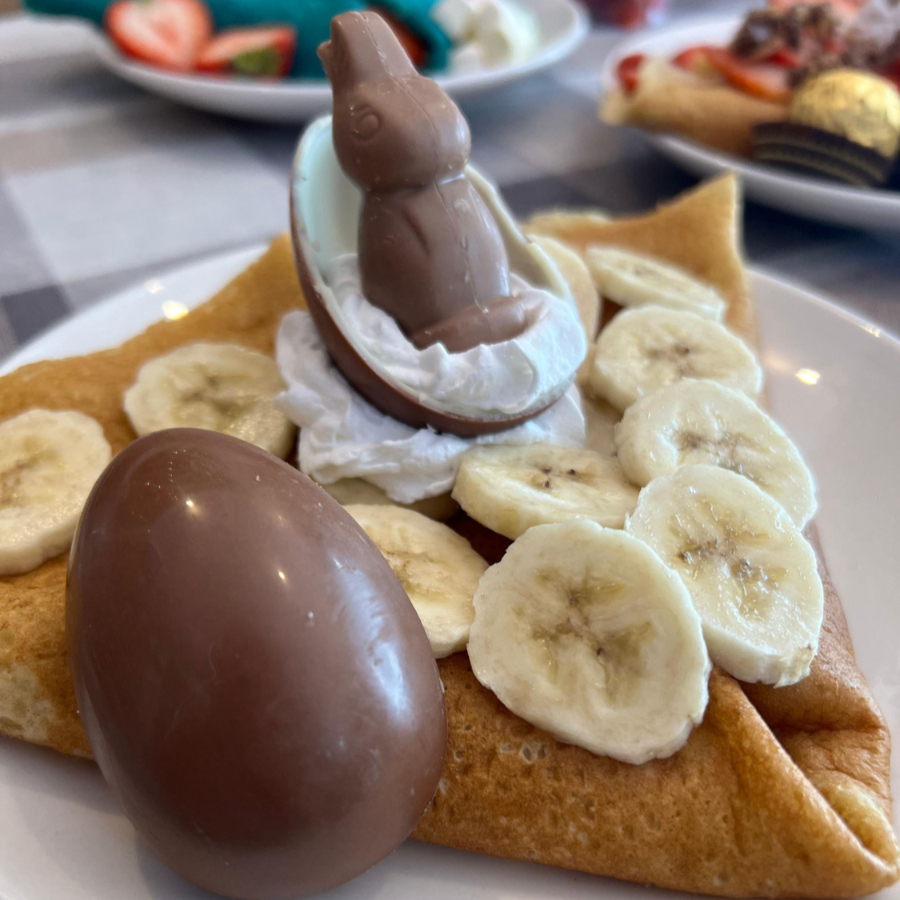 Queso Philadelphia, plátano, huevo Kinder y conejito Turín.
