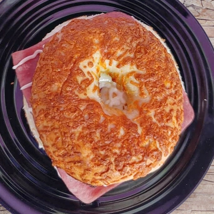 Bagel de queso parmesano relleno de Philadelphia jamon de pierna y queso manchego