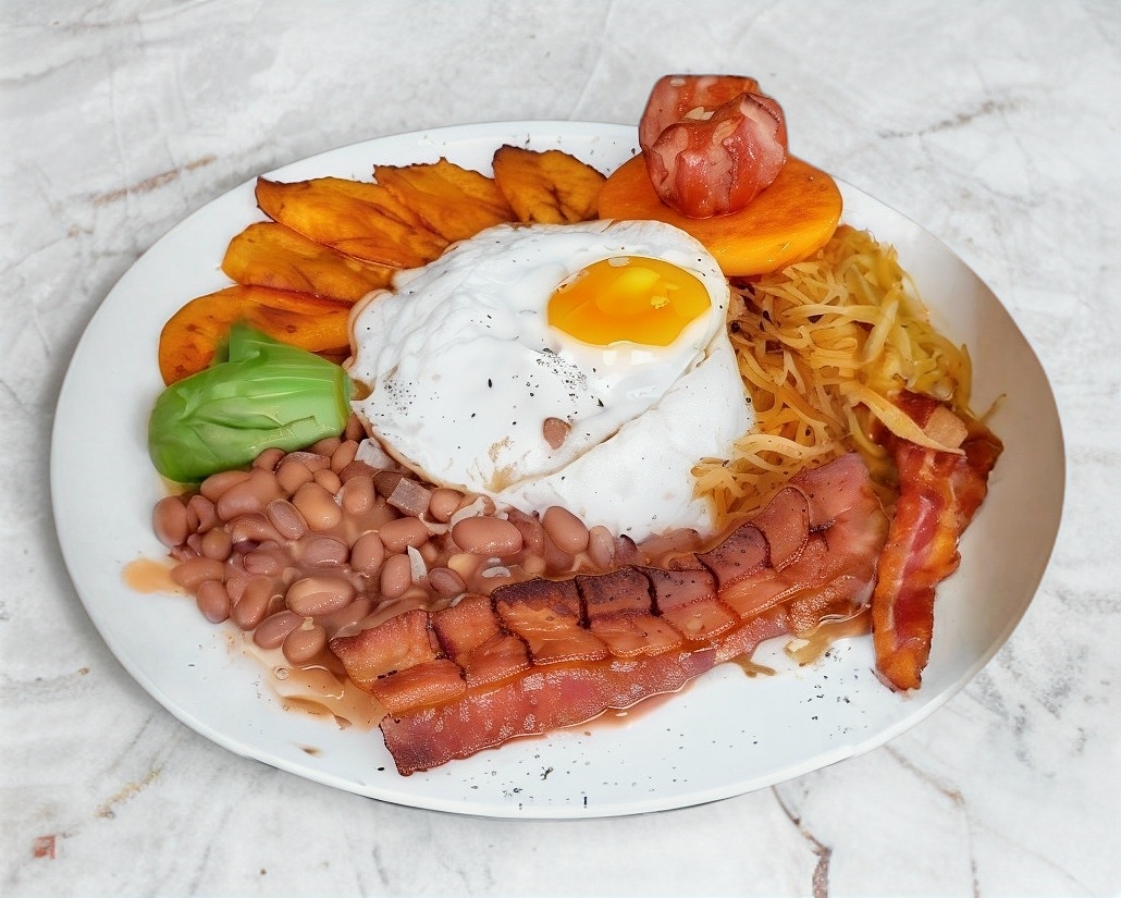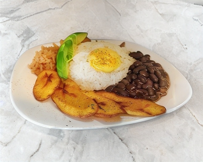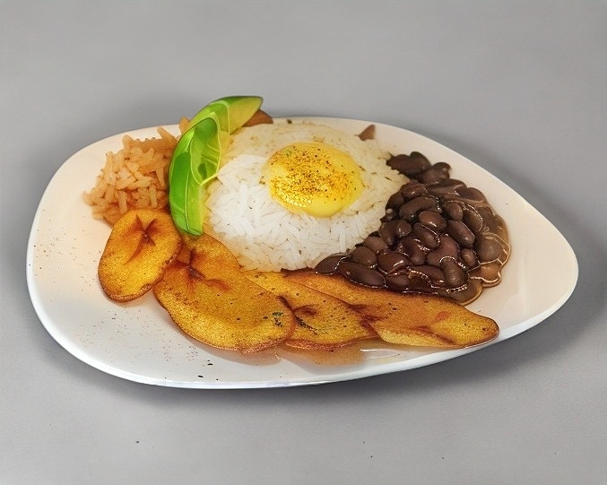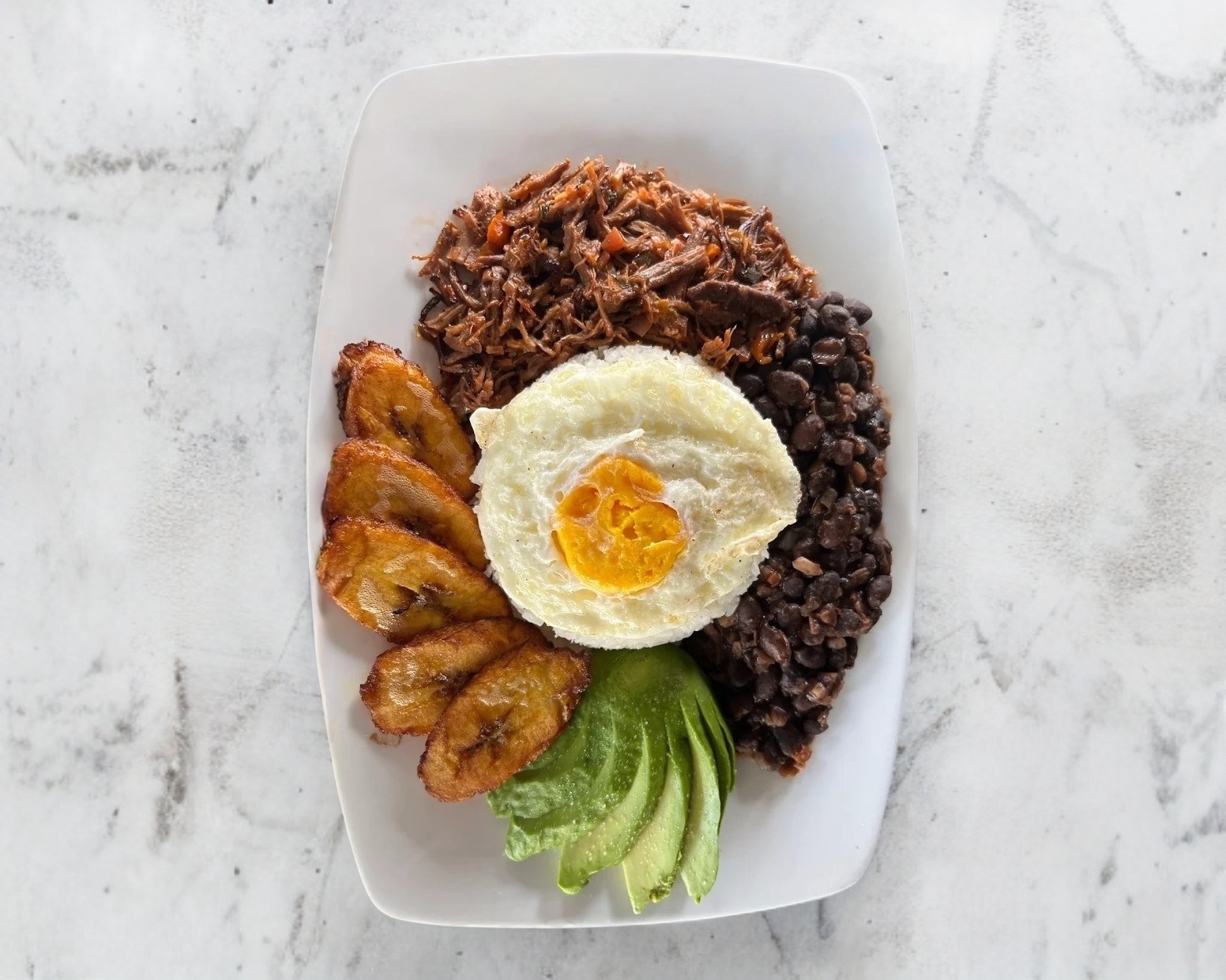 Arroz, frijol negro, carne desmechada, plátano macho frito y huevo estrellado.