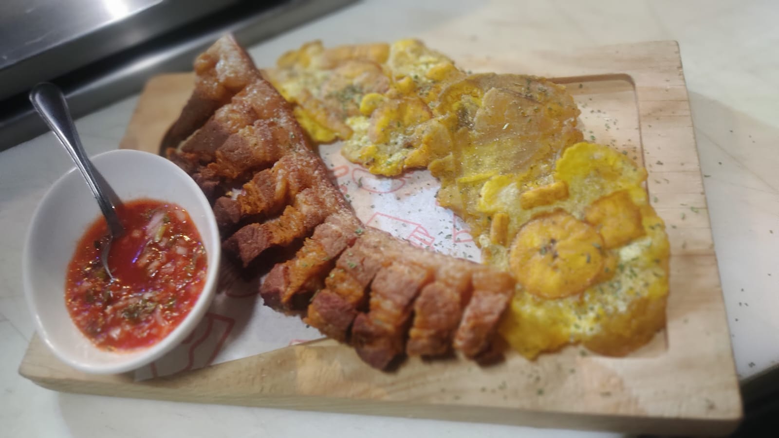 Patacón es plátano macho en su versión crujiente y se acompaña de chicharrón caliente.