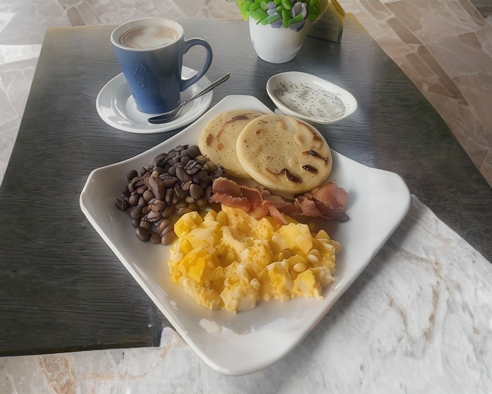 Frijol negro, huevos al gusto, plátano macho frito, queso rallado y arepa.