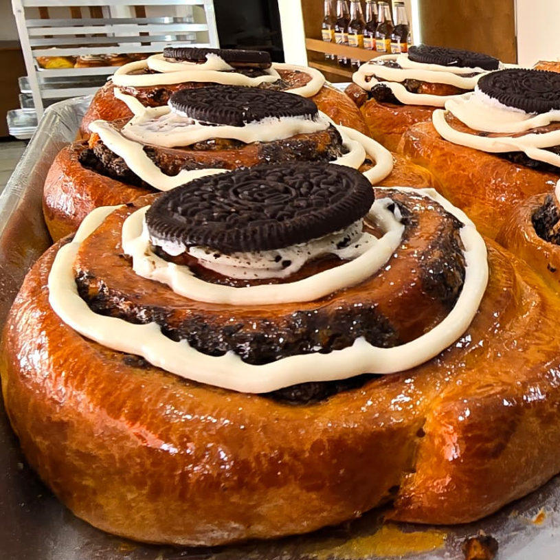Exquisita pieza elaborada con masa Brioché y mezclado con auténtica galleta Oreo, además glaseado con queso crema y azúcar.
