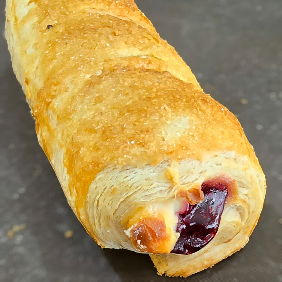 Elaborado con una exquisita masa tipo Francés, de textura suave y azucarada. Además de un delicioso relleno de queso Philadelphia y mermelada de Zarzamora.