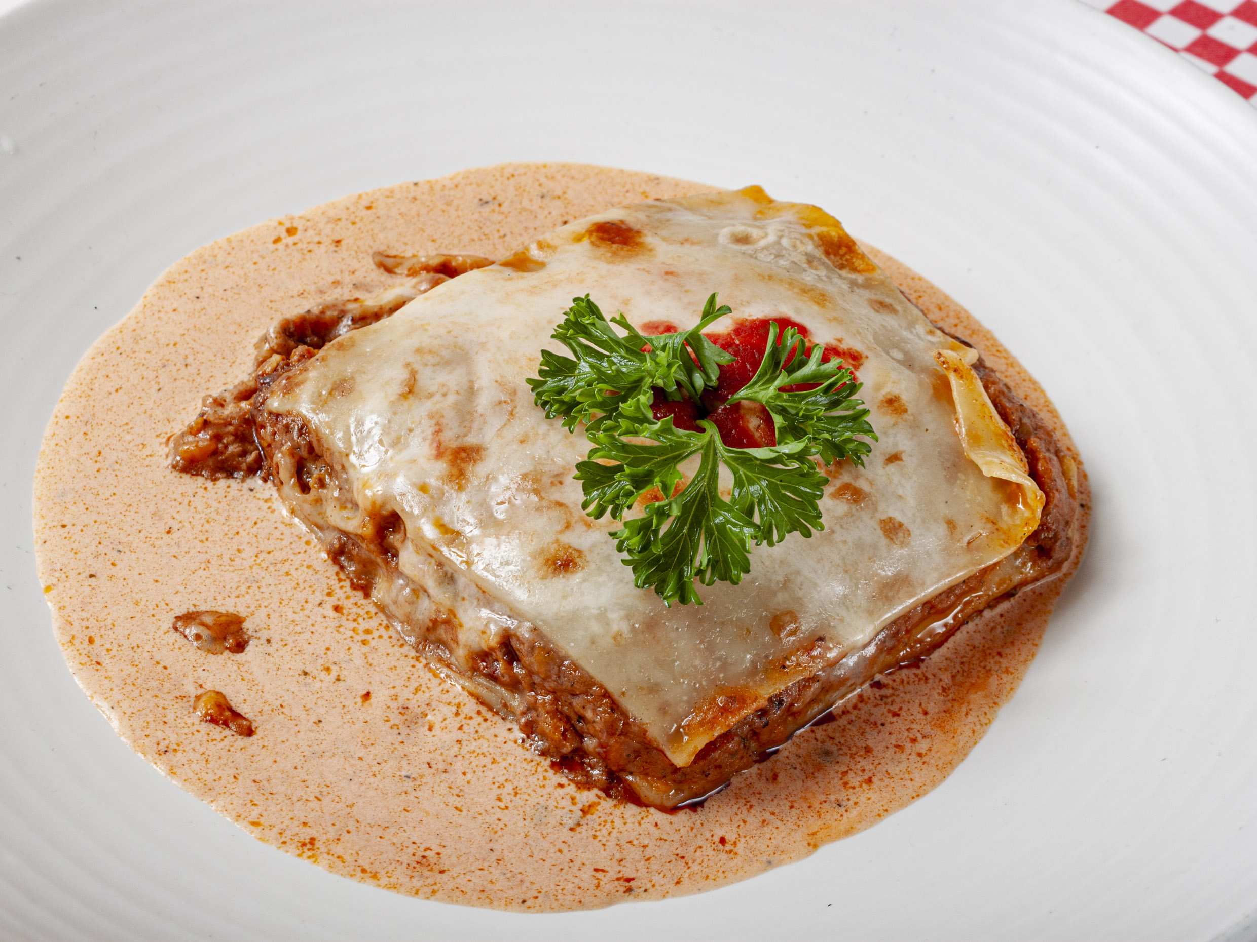 350 Gr. de pasta servida en laminas intercaladas, con carne de res y abundante queso gratinado.