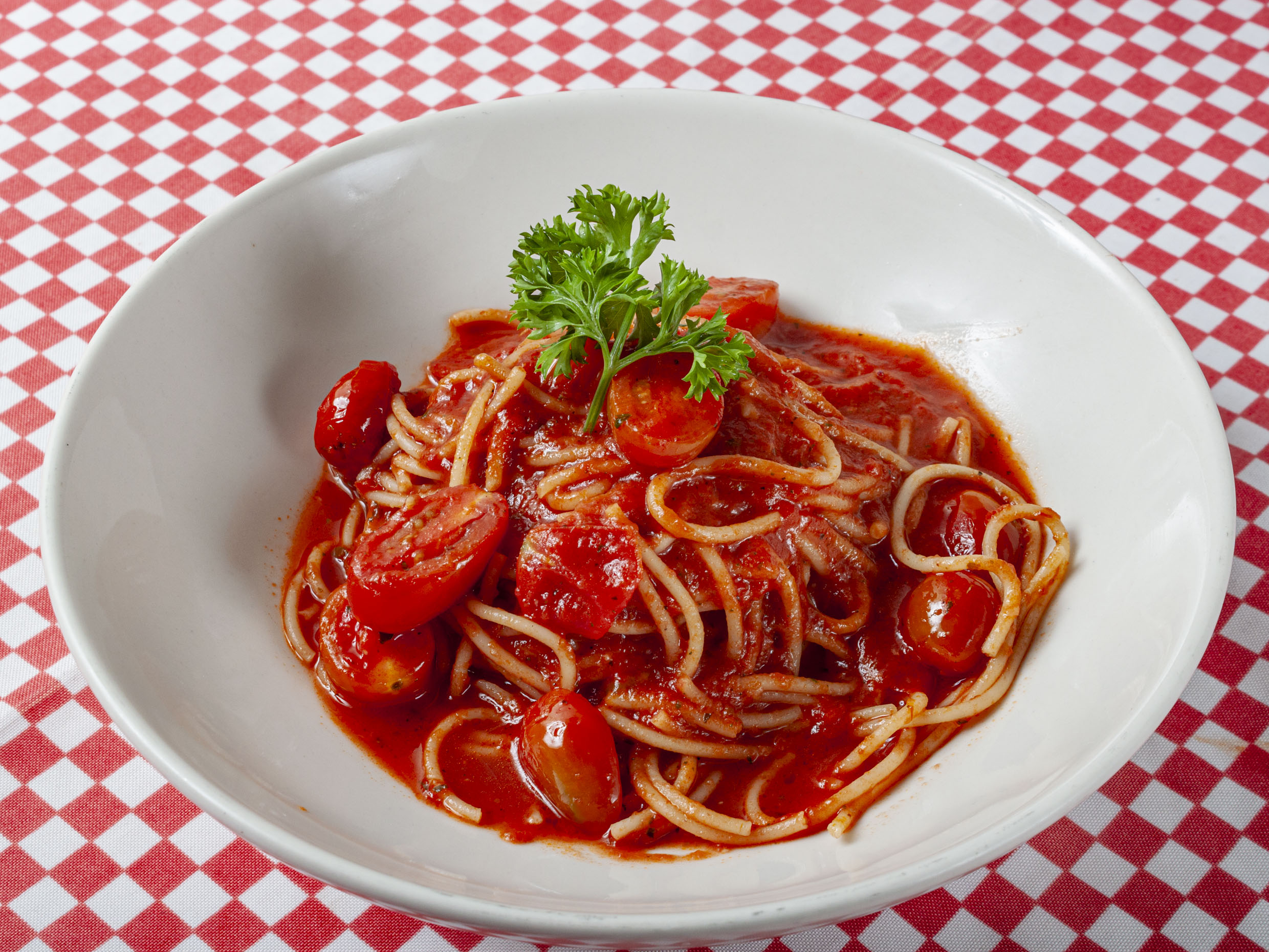 250 gr. de pasta bañada en salsa pomodoro, jitomates cherries y queso al gusto.