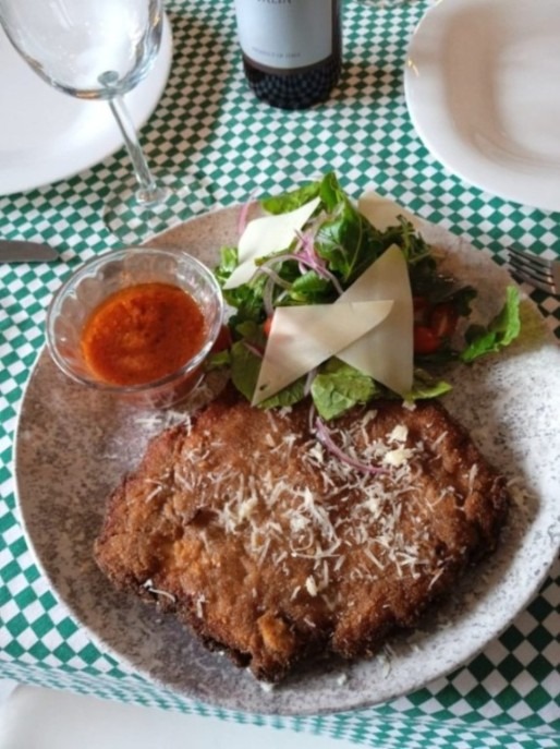 Pechuga marinada y empanizada de queso parmesano con pan, acompañada de una ensalada de arugula, cebolla morada y cherries junto con un deep de salsa arrabiata