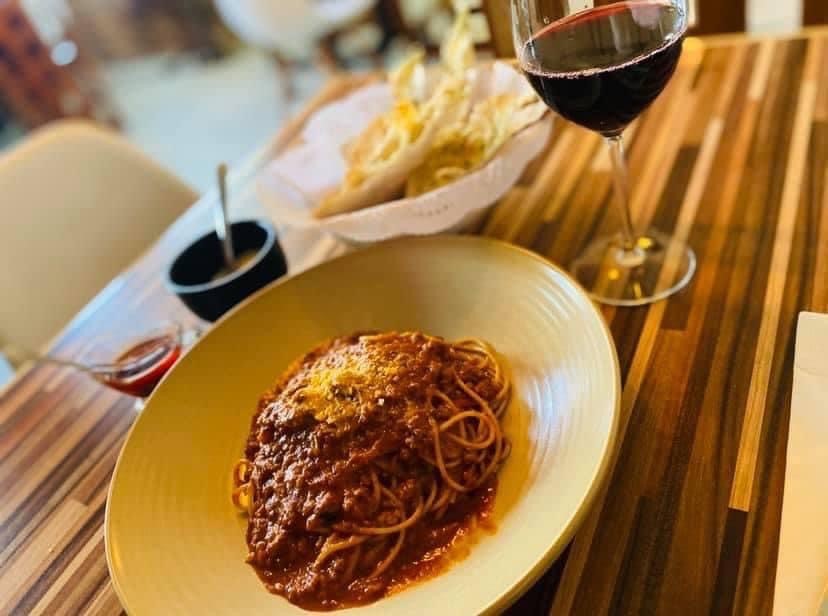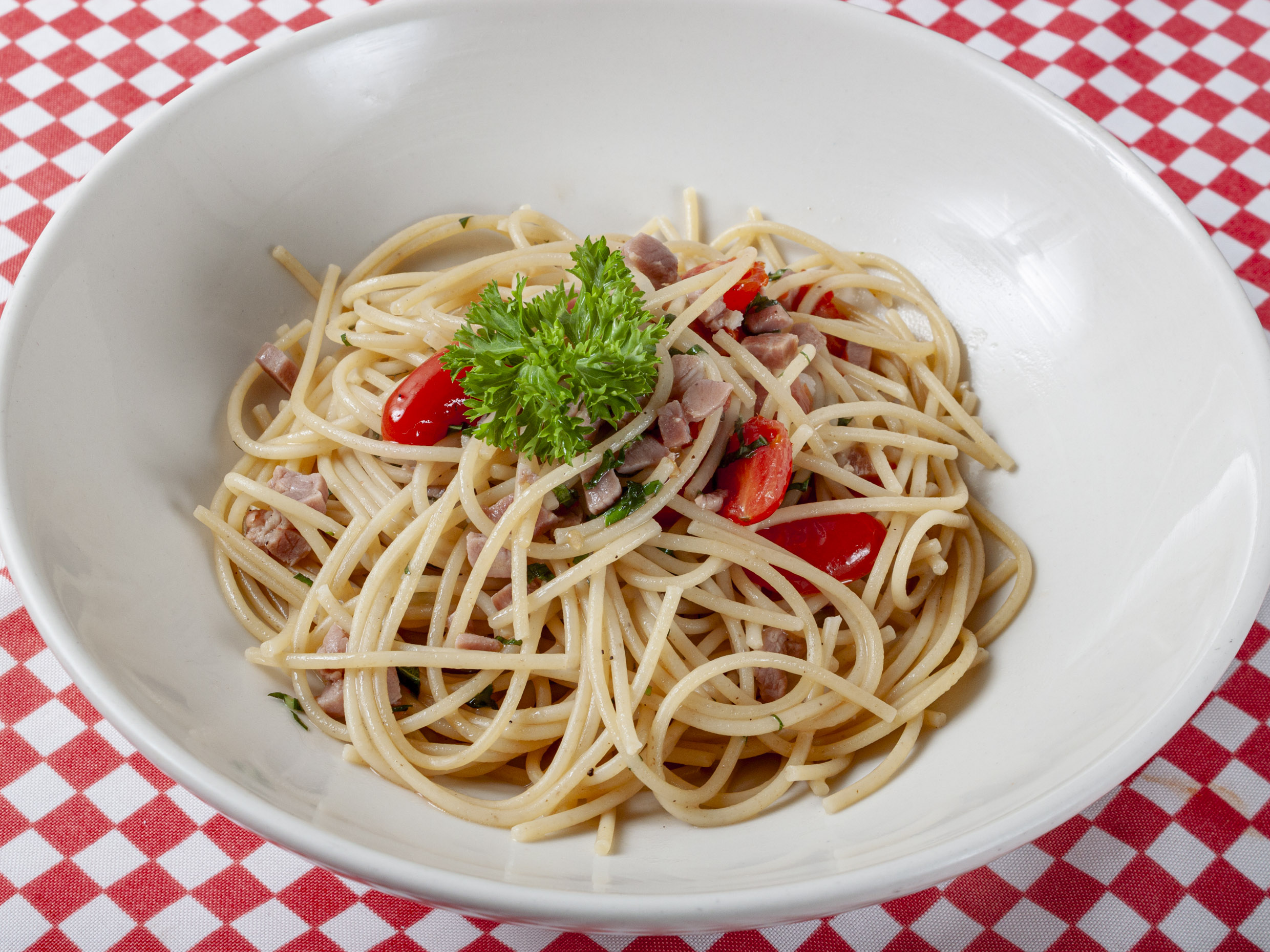 Pasta acompañada de prosciutto, jitomate cherry, albahaca y un toque de vino blanco.