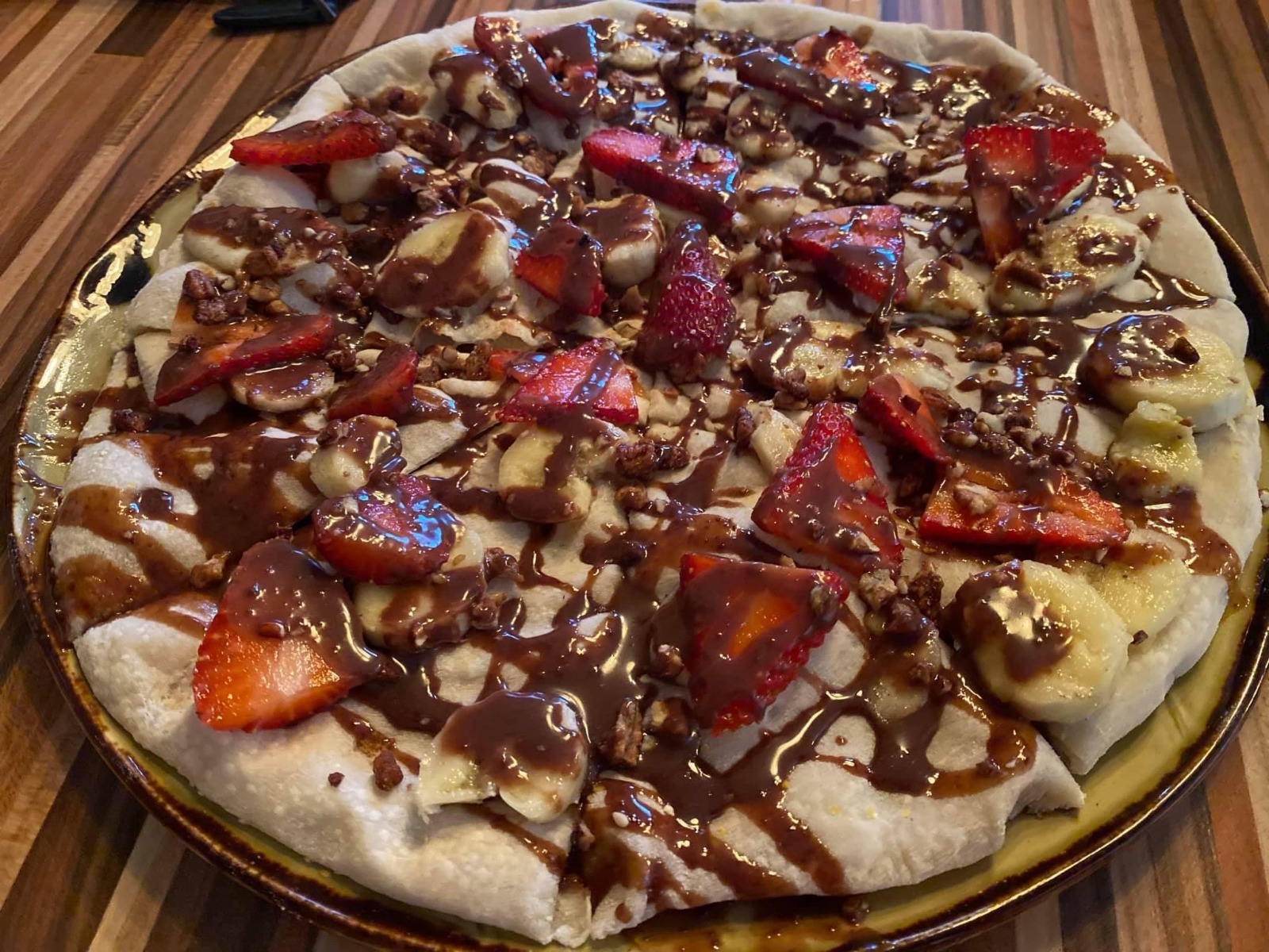 200 Gr. pizza dulce a base de crema de avellana, plátano, nuez y fruta de temporada.