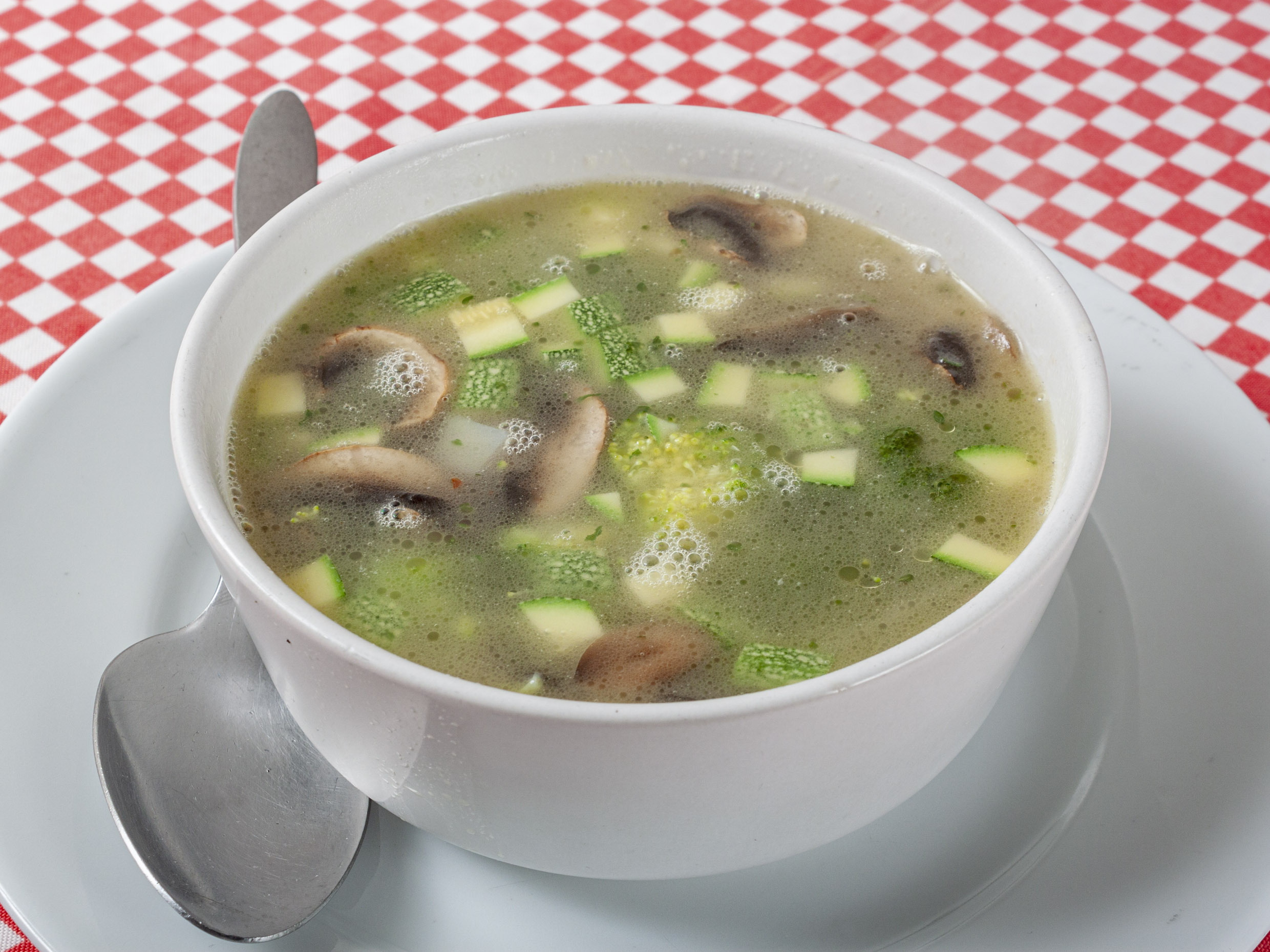 Sopa de verduras al dente, con queso parmesano, acompañada de pasta.