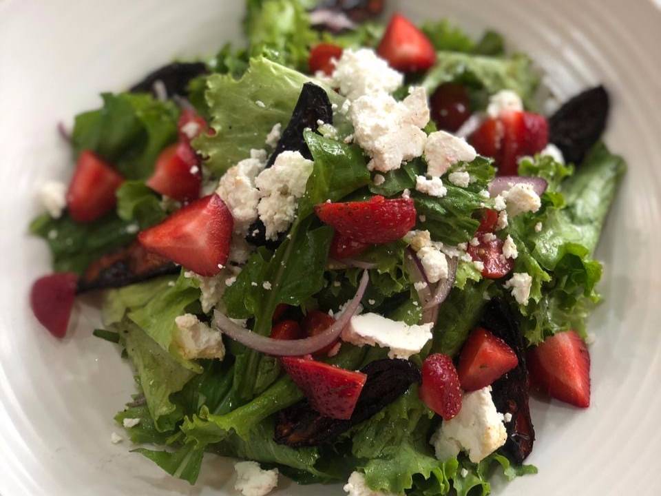 Mix de lechuga, arugula, cebolla morada, jitomate rostizado, queso de cabra, aguacate y vinagreta.