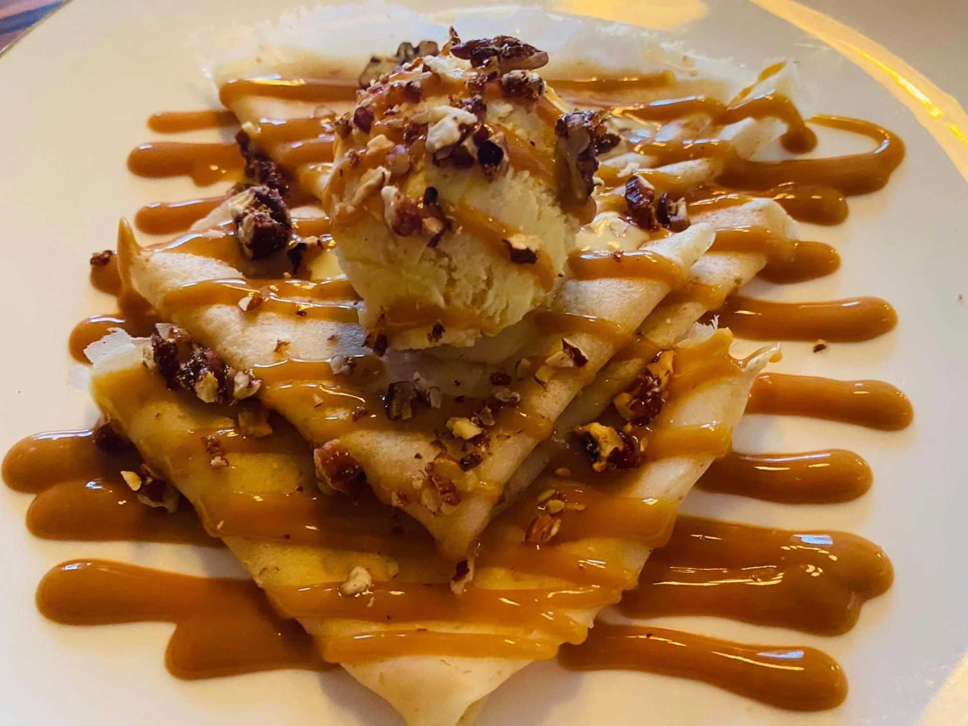 150 Gr. de crepas bañada con cajeta o crema de avellana, con un bola de helado y nuez caramelizada.