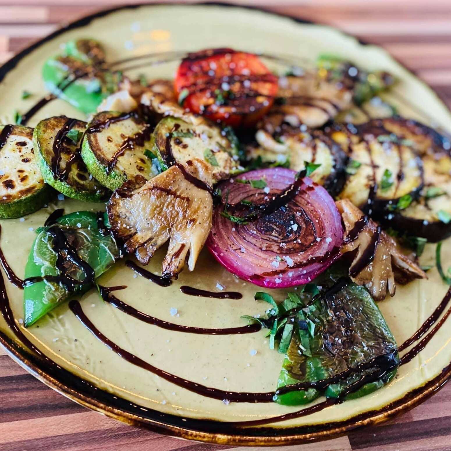 350 Gr. de verduras a la parrilla, calabaza italiana, berenjena, jitomate bola, cebolla morada, pimientos y espárragos, acompañado de glasé de vinagre balsámico y aceite de olivo.