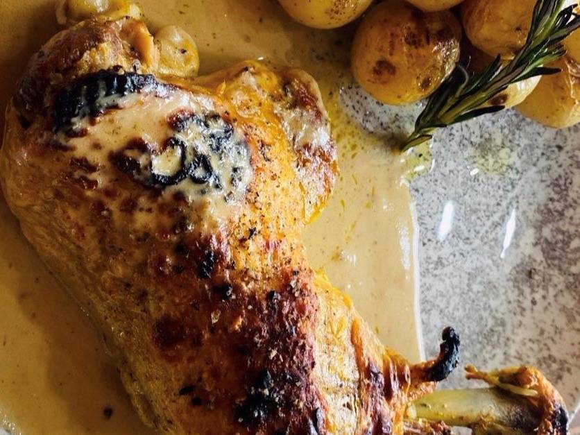 350 Gr. de pierna y muslo de pollo al horno, bañados en salsa gravy, con papas al romero.