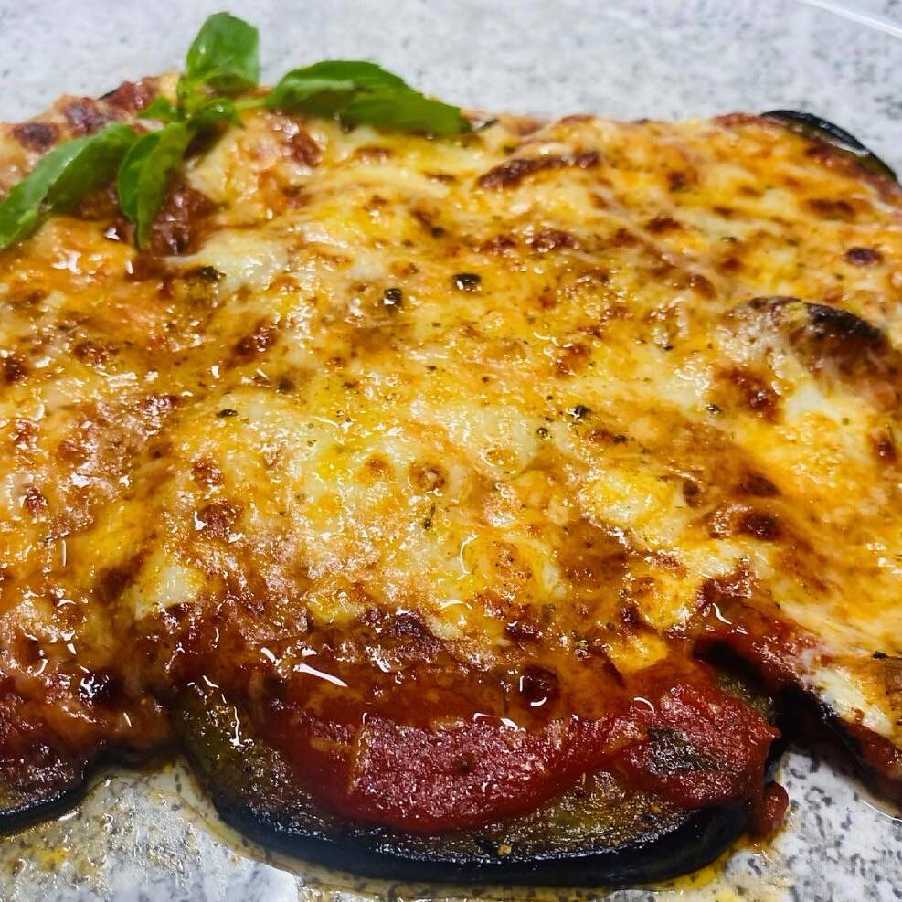Rodajas de berenjena, bañadas en salsa pomodoro, gratinadas al horno, con queso parmesano.