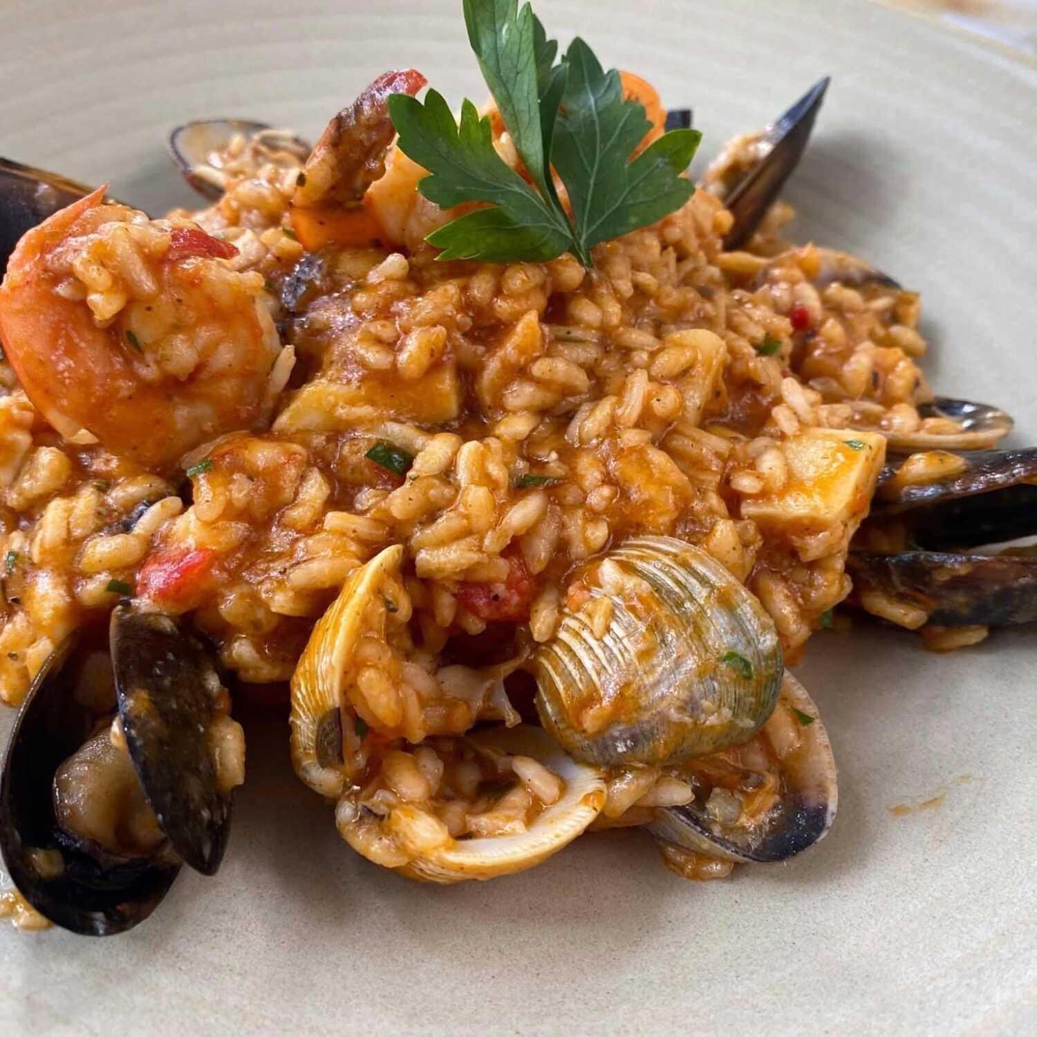Arroz arbóreo cremoso, acompañado con camarón, almeja, mejillón y un mix de mariscos.