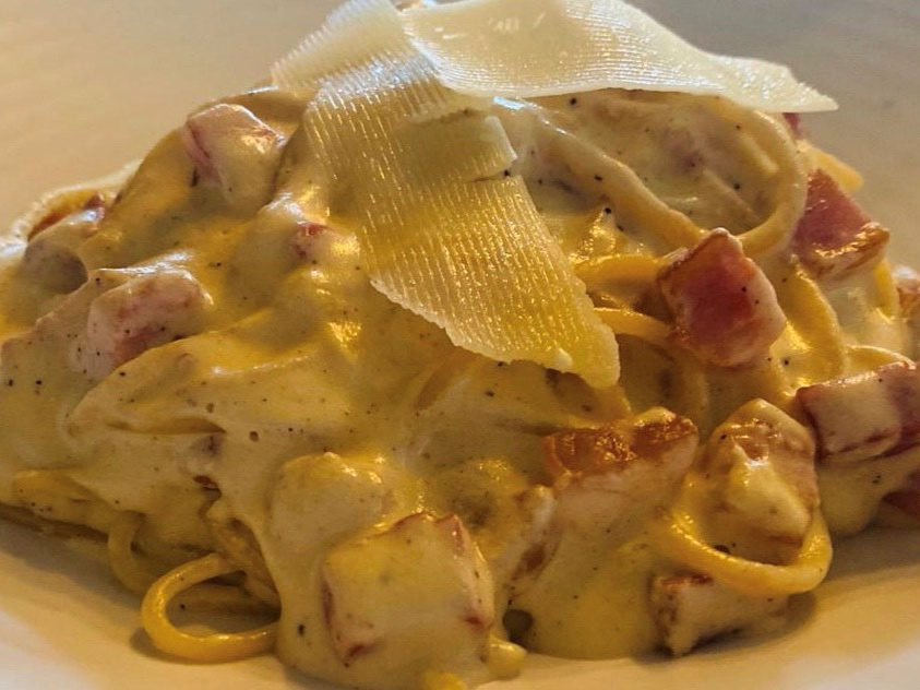260 gr. de pasta con salsa cremosa de queso y pancetta.