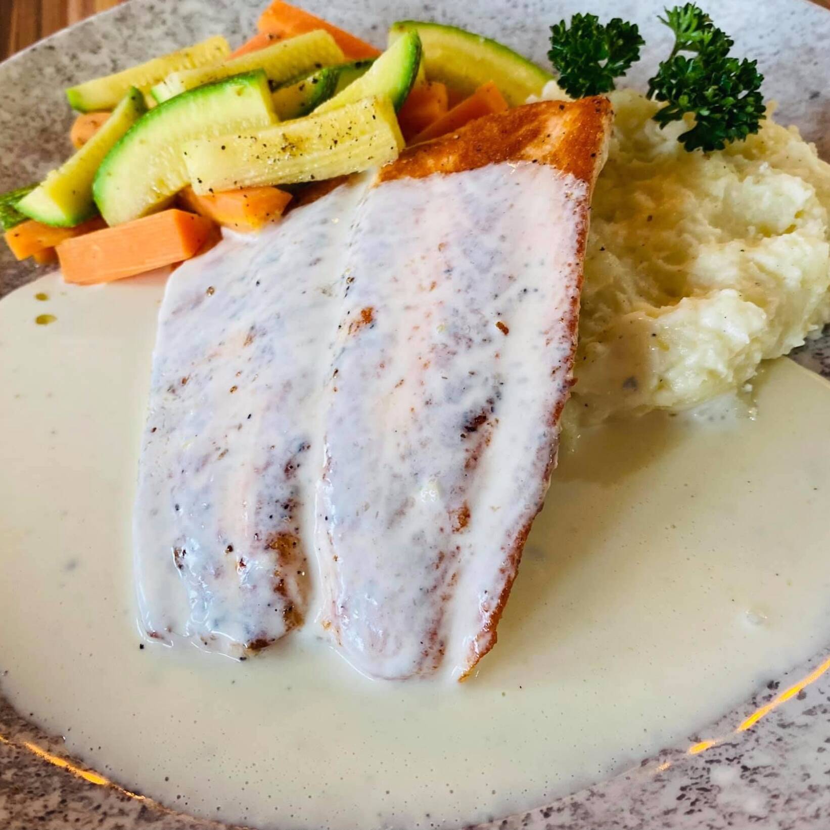 Salmón en salsa de quesos, acompañado de puré y verduras al vapor.