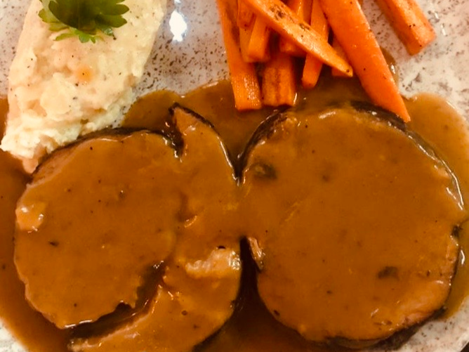 230 Gr. medallones de res en cocción larga, zanahoria dulces y puré de papa.