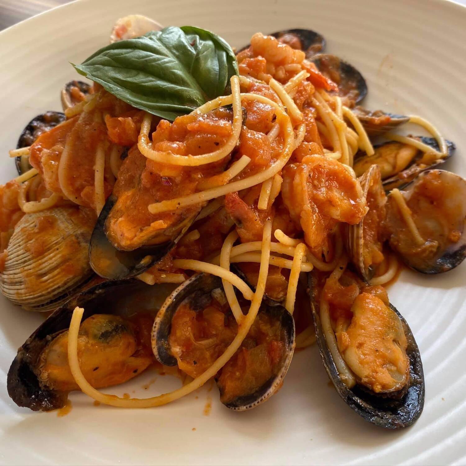 Pasta en salsa pomodoro, con mariscos (camarón, mejillón, almeja y callo de hacha).