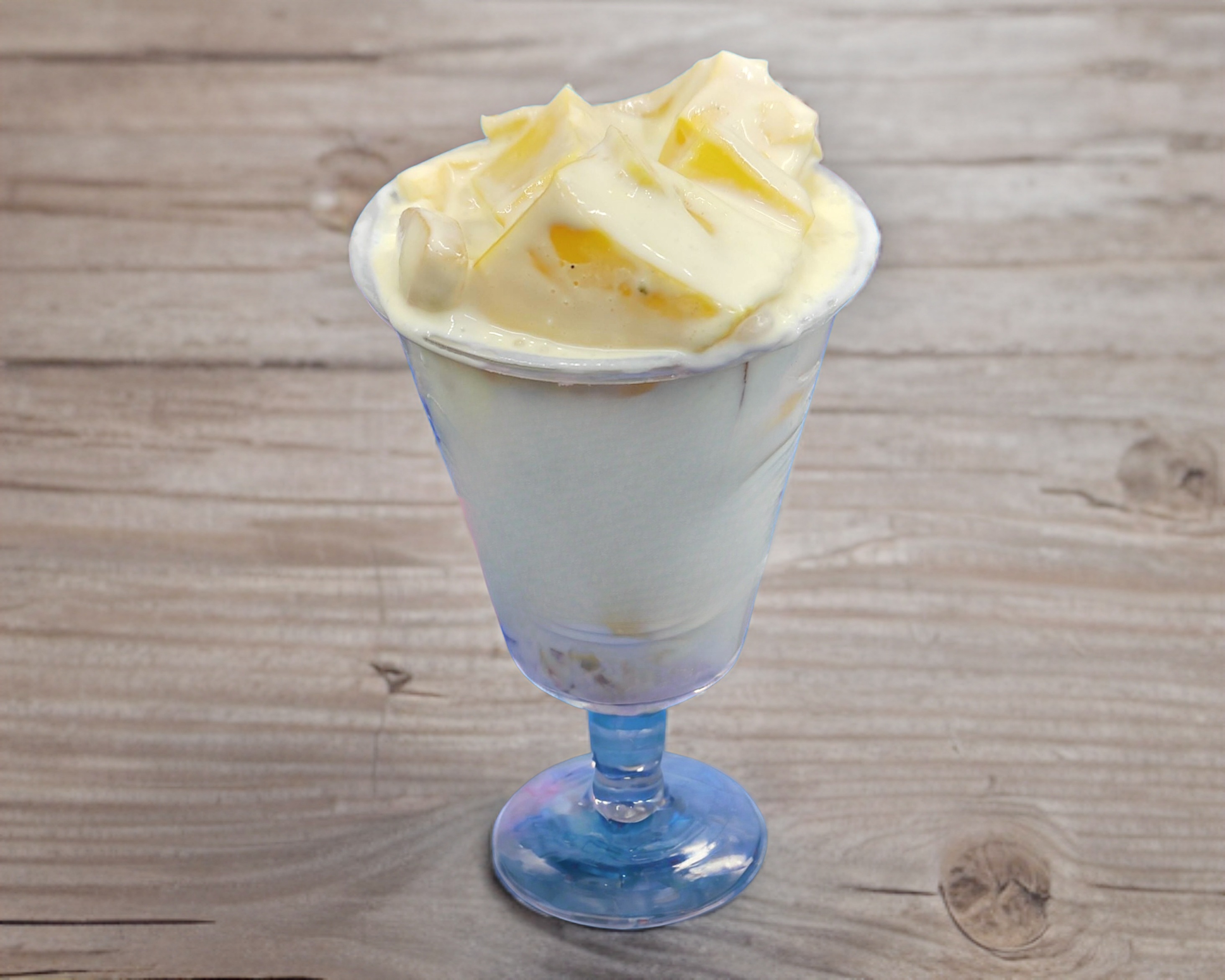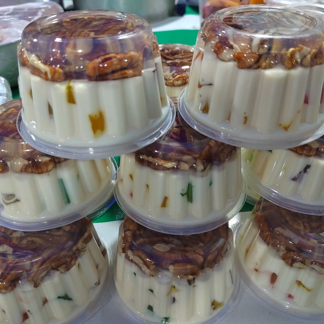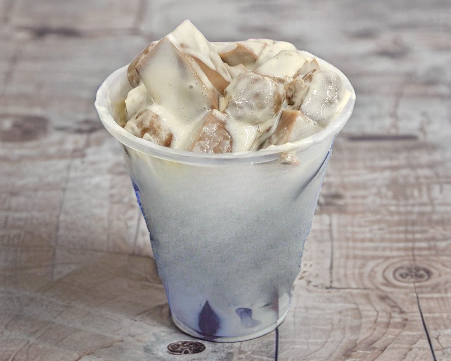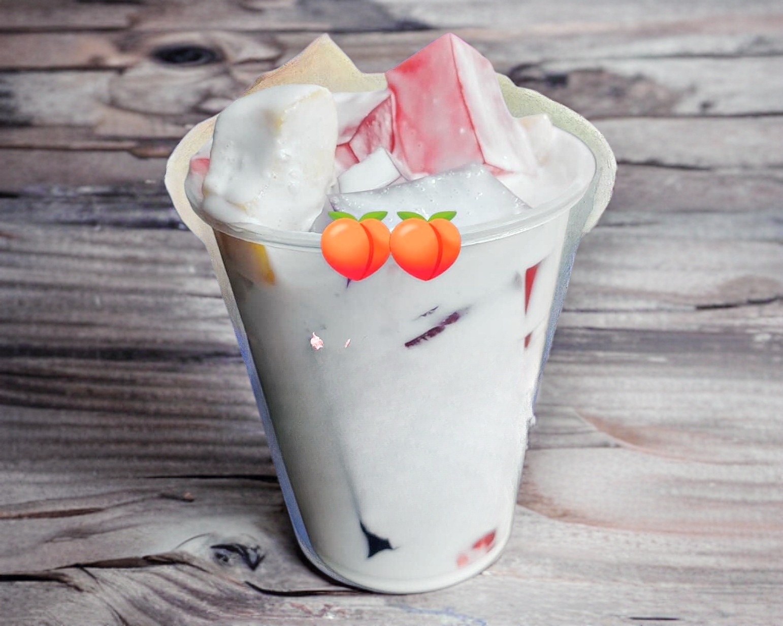 Gelatina de leche sabor rompope con duraznos cortados en cubos y crema preparada