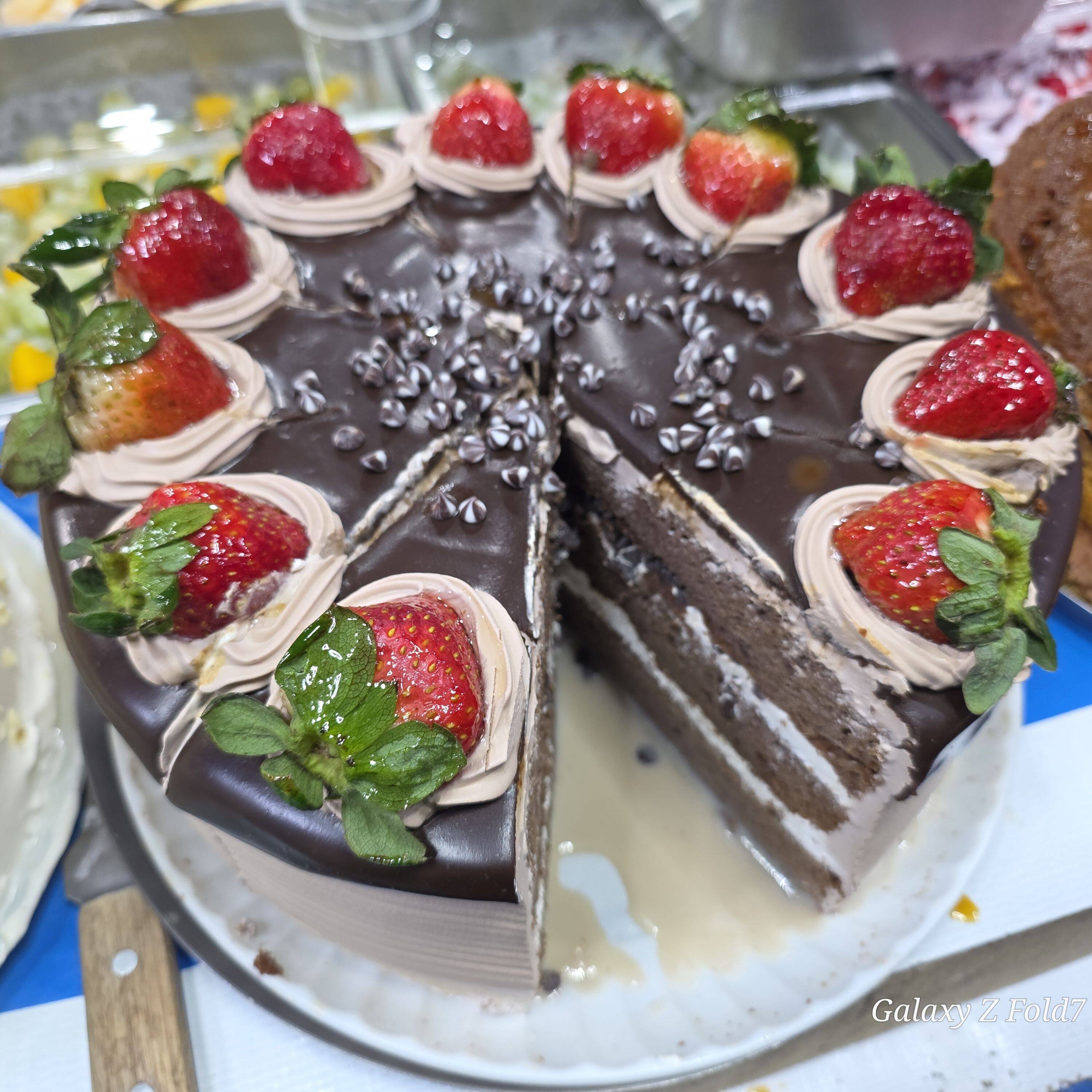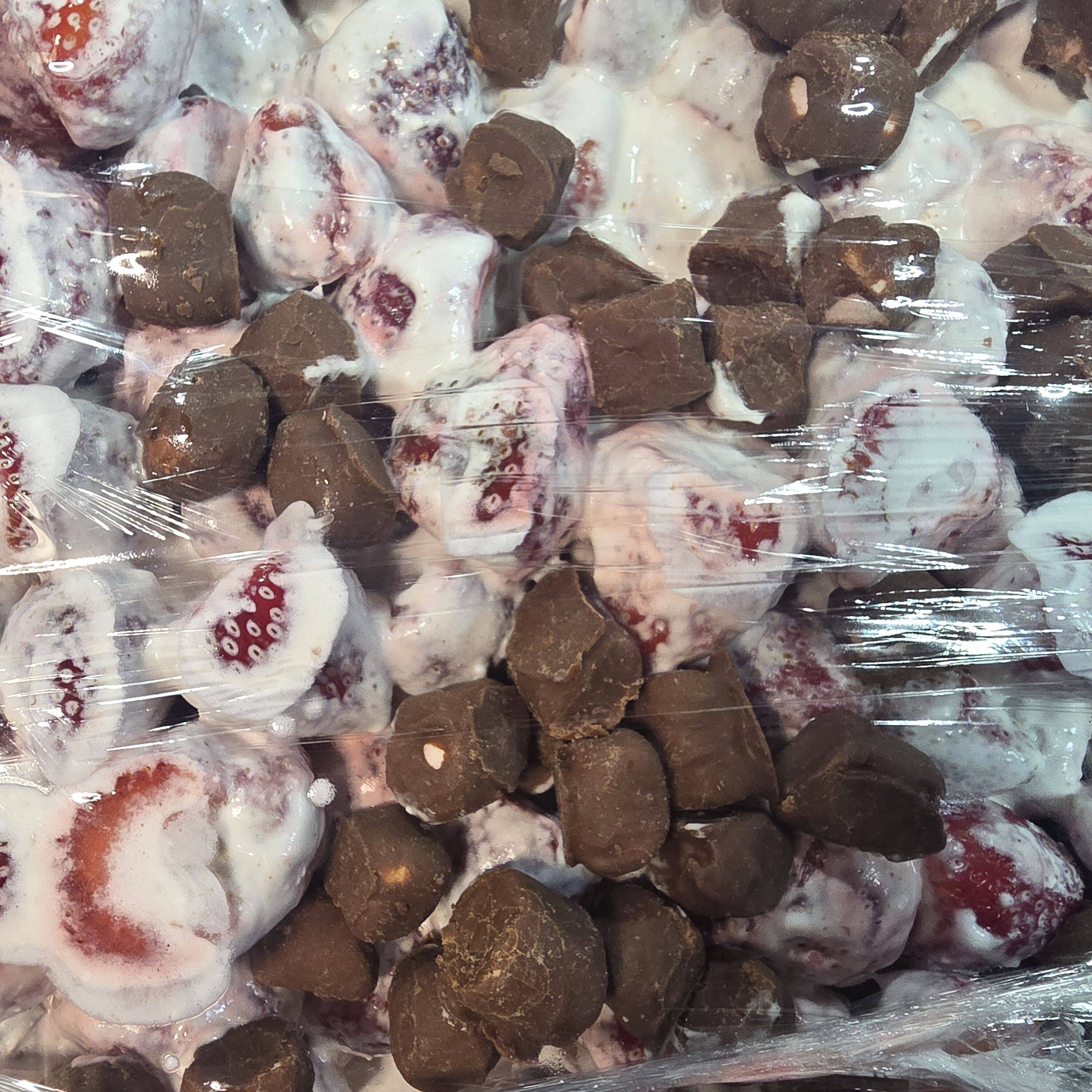 Ricas fresas en pedasos con bombones cubiertos de chocolate
