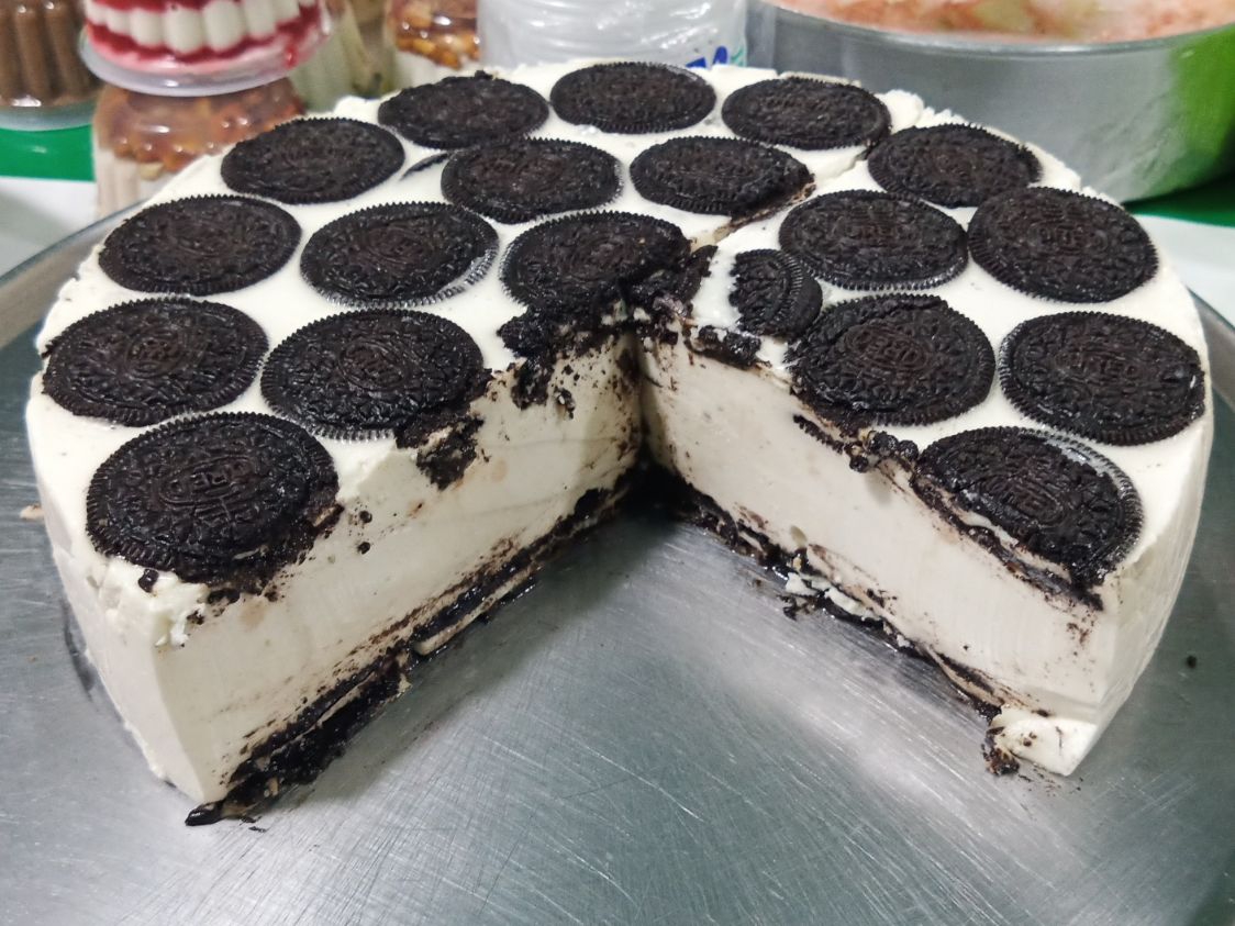 Gelatina sabor a queso con galleta oreo en trozos