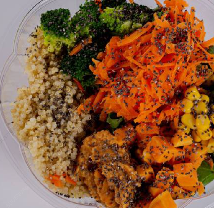 Base: 1/2 quinoa y 1/2 lechugas, toppings: brócoli, zanahoria rallada, camote cocido, granos de elote, hummus garbanzo con chipotle y semillas de chía, incluye un aderezo a elección.
