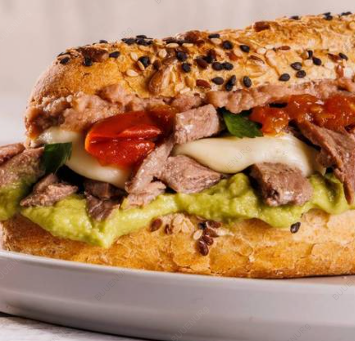 Arrachera marinada, quesillo, frijoles, guacamole, salsa chiltomate, cilantro y pimienta, el baguette contiene semillas.