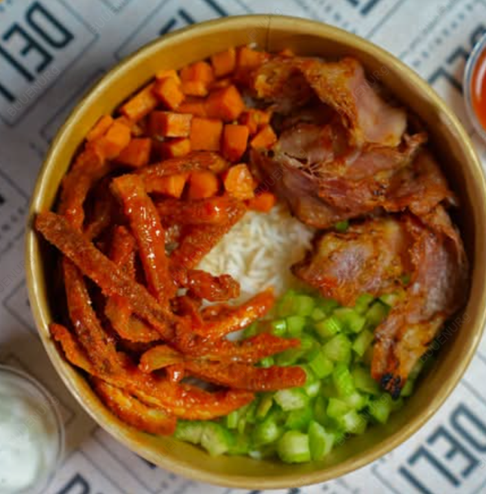 Bowl Pollo Red Hot _ con tocino; camote con soya