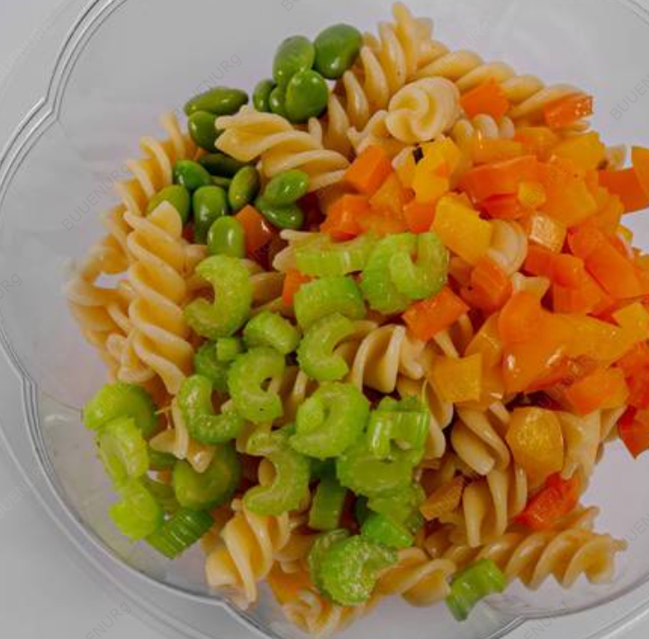 Pasta fusilli con aceite de oliva y ajo, acompañada de pepino, apio, edamamesy pimientos morrones.