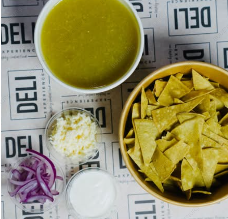 Bowl chilaquiles verdes, tortilla de maíz, nopal nopalina, crema, queso y cebolla, la salsa verde contiene consomé de pollo.