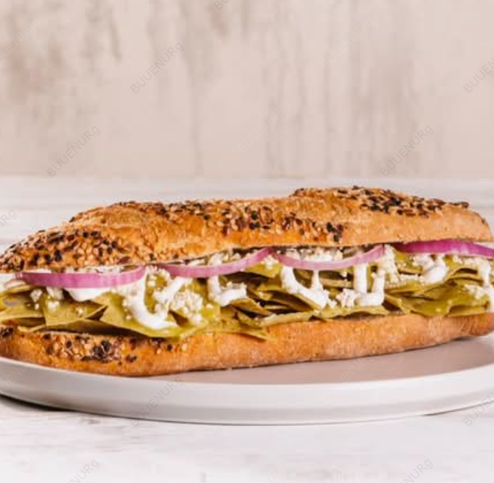 El baguette contiene semillas, quesillo, incluye pico de gallo y jitomate.