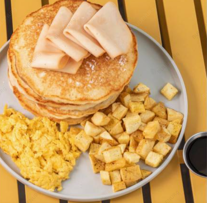 Hot cakes con jamón de pavo, papas deli experience pimienta y limón y huevo natural.