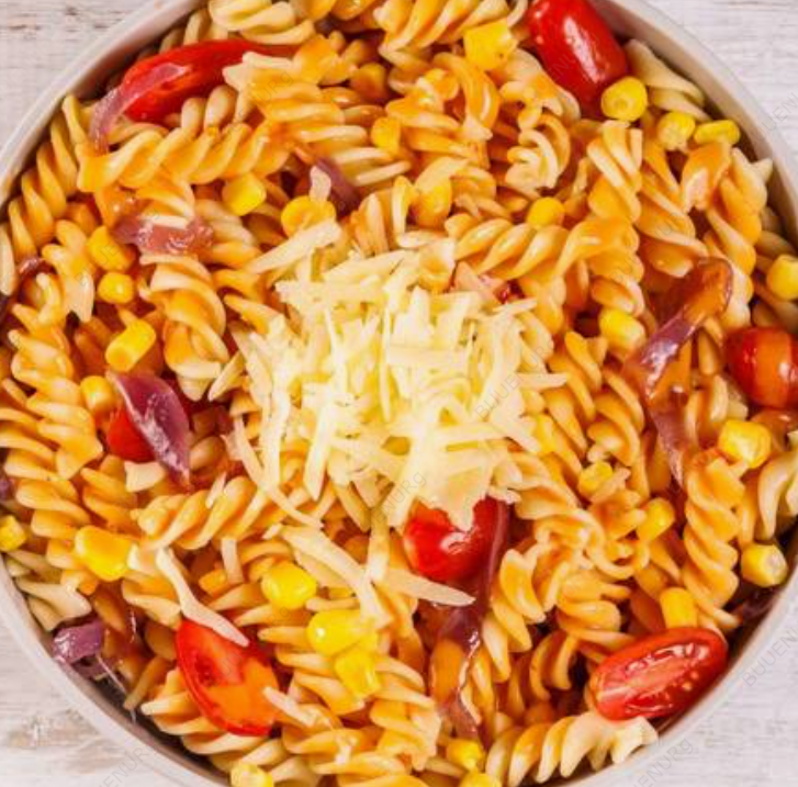 Pasta fusilli, con salsa rosa con chipotle, elotito, tomate cherry, cebolla caramelizada y queso parmesano.