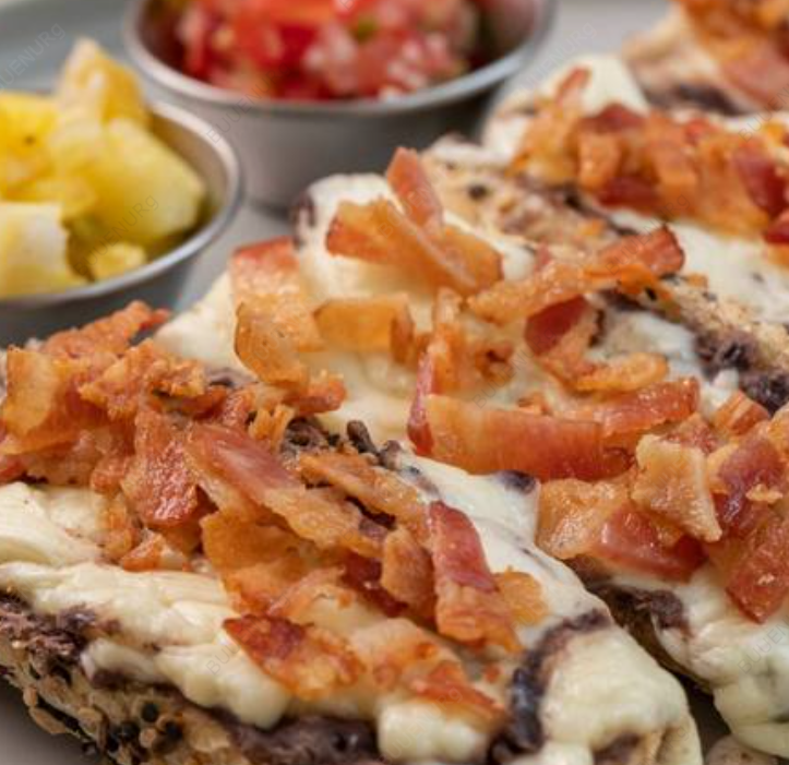 Jamón de pavo ahumado, tocino, huevo, quesillo, tomate deshidratado y aceite de ajo.
