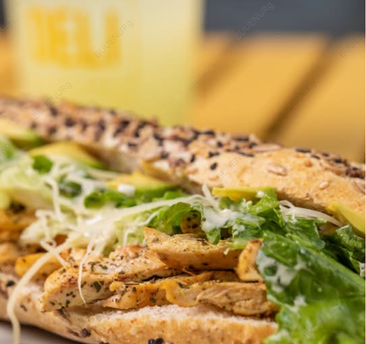 Pechuga a las finas hierbas, lechuga, aguacate, queso parmesano y aderezo césar, el baguette contiene semillas.