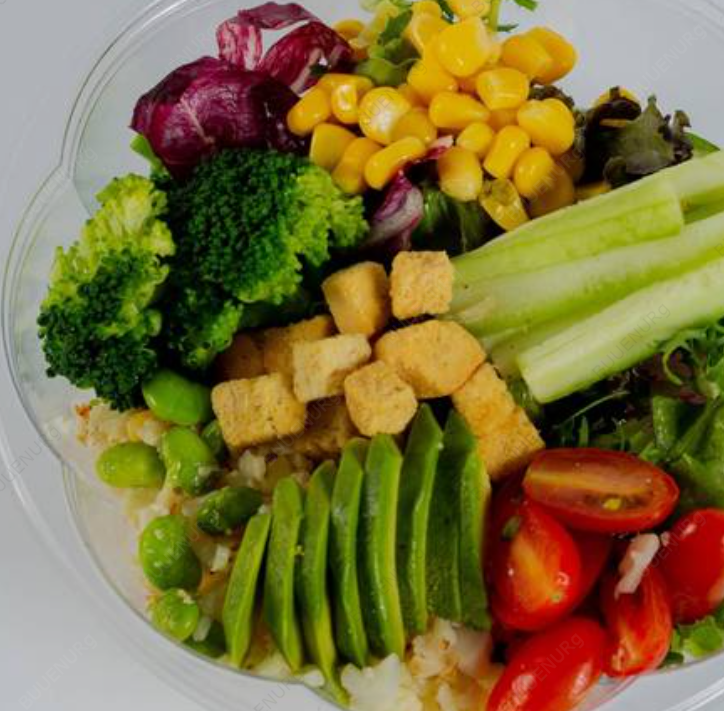 Base: 1/2 variedad de lechugas y arroz 1/2 arroz de coliflor, toppings: tomate cherry, elote en grano, pepino, edamames, brócoli, aguacate y crutones, incluye un aderezo a elección.