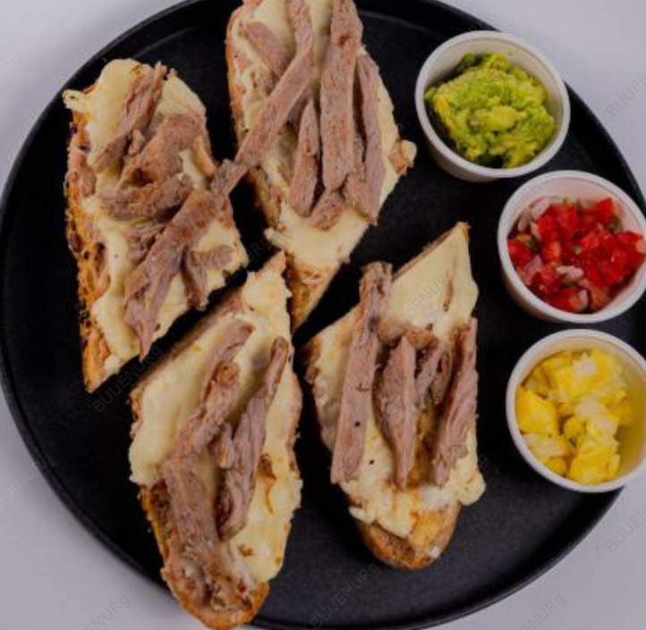 Arrachera marinada, quesillo, frijoles, guacamole, salsa chiltomate, cilantro y pimienta, el baguette contiene semillas las papas tienen pimienta limon