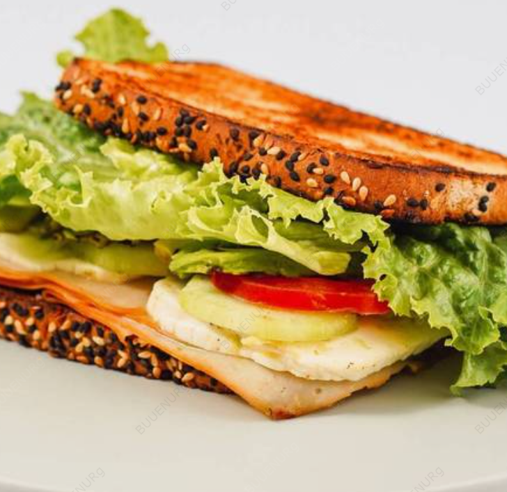 Jamón de pavo ahumado, queso panela, lechuga, jitomate, pepino y aguacate.