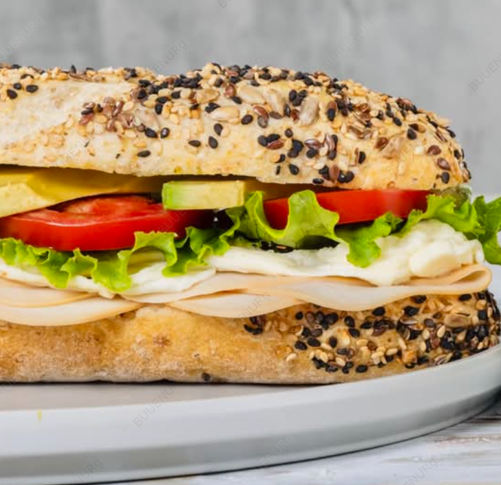 Jamón de pavo ahumado, quesillo, lechuga, aguacate y jitomate, el baguette contiene semillas.